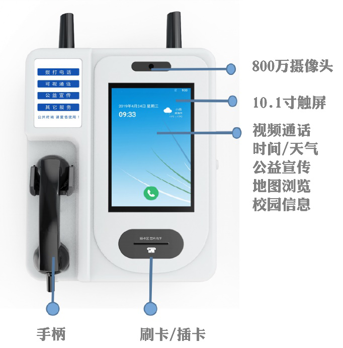 新一代智能校园公共通话解决方案是对传统公共话机的革新,老式校园公共插卡话机,只能达到基本的通话功能,智能校园公共通话解决方案在基本通话功能的基础上,实现 4G Volte视频通话、WIFI、信息浏览、校方与学生互动等功能。从外观、功能、互动体验大大提升,同时也有助力校园精细化管理,提升和谐平安校园建设。